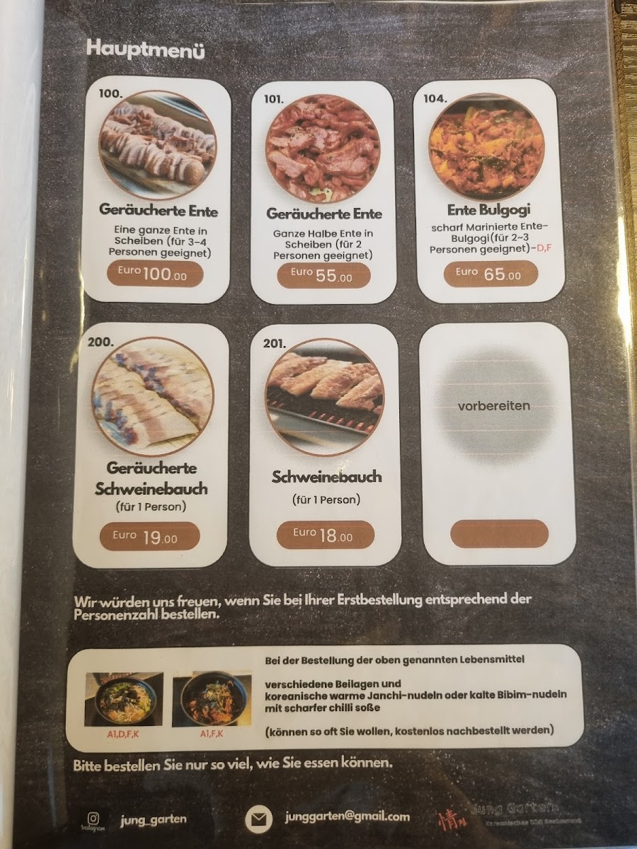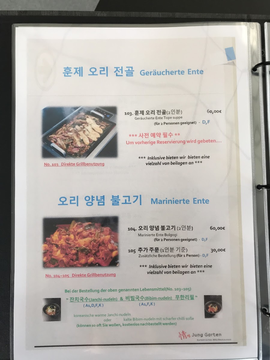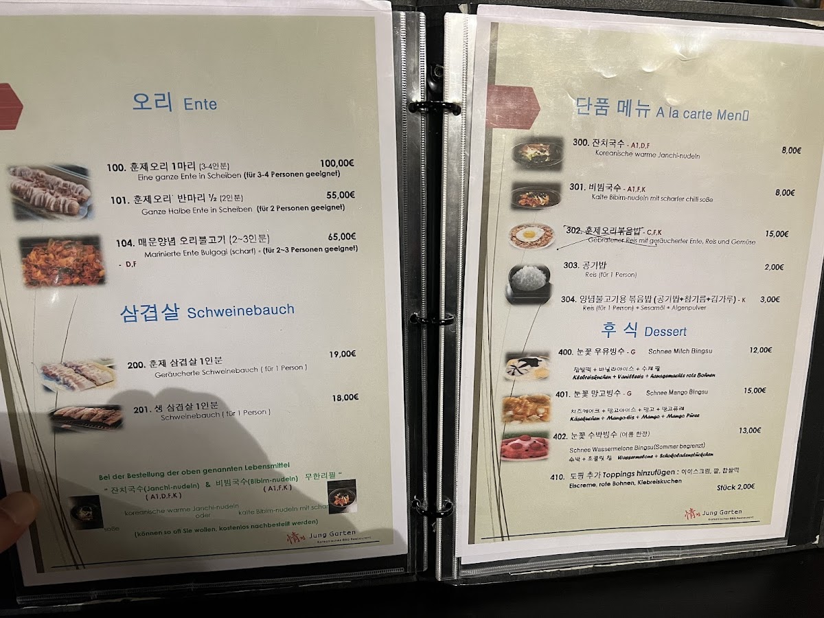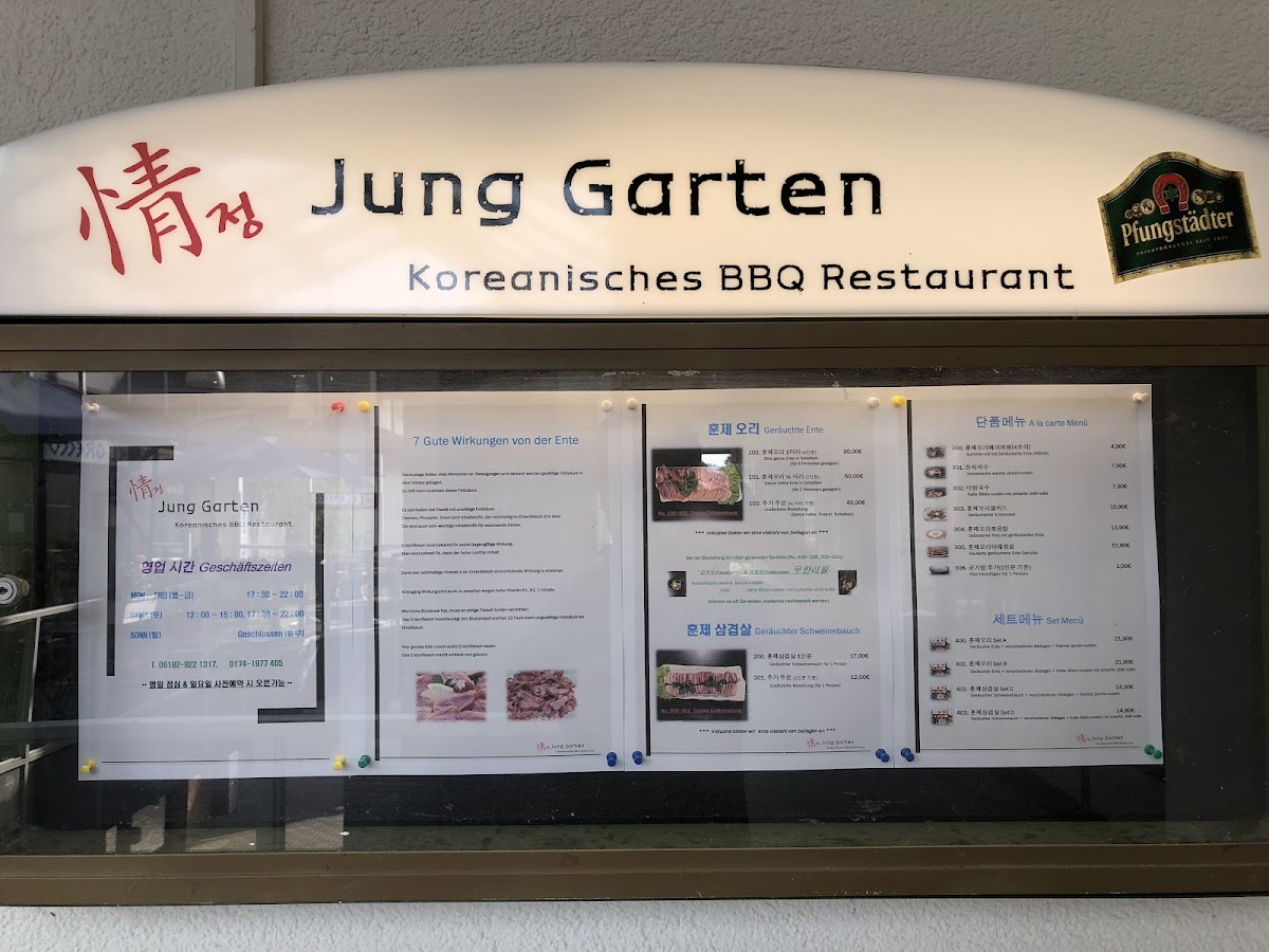 Welcome to Jung Garten Koreanisches BBQ, a hidden gem located in Kriftel that delights with its authentic Korean dining experience. Nestled on Frankfurter Str., this restaurant brings the warmth of Korean hospitality to every table. The main attractions on the menu are the exquisite cuts of pork and smoked duck, both cooked right at your table for an interactive feast. Customers rave about the tender and flavorful duck, ideal for sharing with friends or family.
